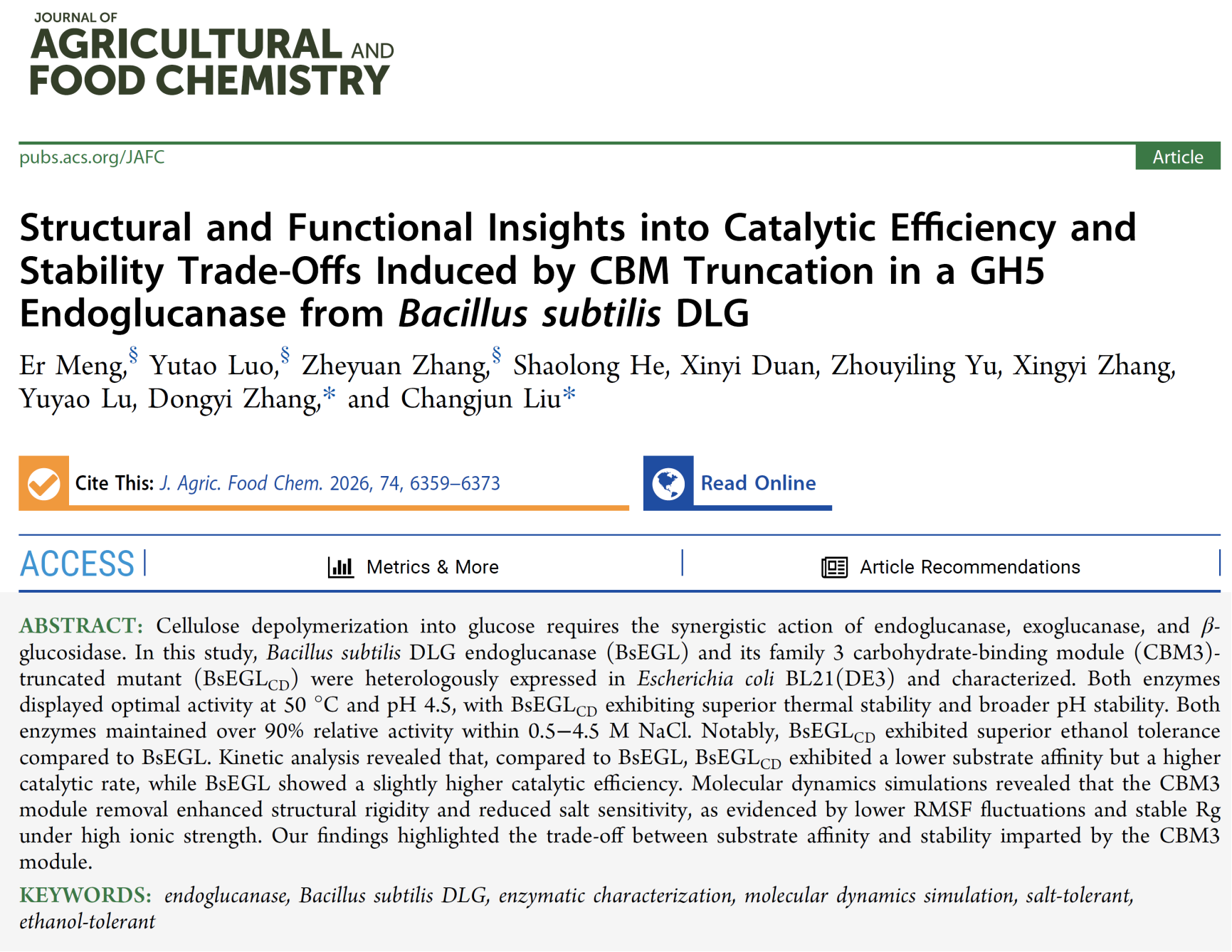 近日,湖南科技大学生命科学与健康学院合成生物团队在纤维素酶分子改造研究方面取得新进展。团队成功解析了枯草芽孢杆菌Bacillus subtilis DLG的GH5内切葡聚糖酶及其CBM3结构域截短突变体的酶学特性与结构功能关系,揭示了碳水化合物结合模块在底物亲和力与构象稳定性之间的权衡调控机制。该成果已在农林科学领域顶级学术期刊《Journal of Agricultural and Food Chemistry》(中科院一区TOP期刊)发表。