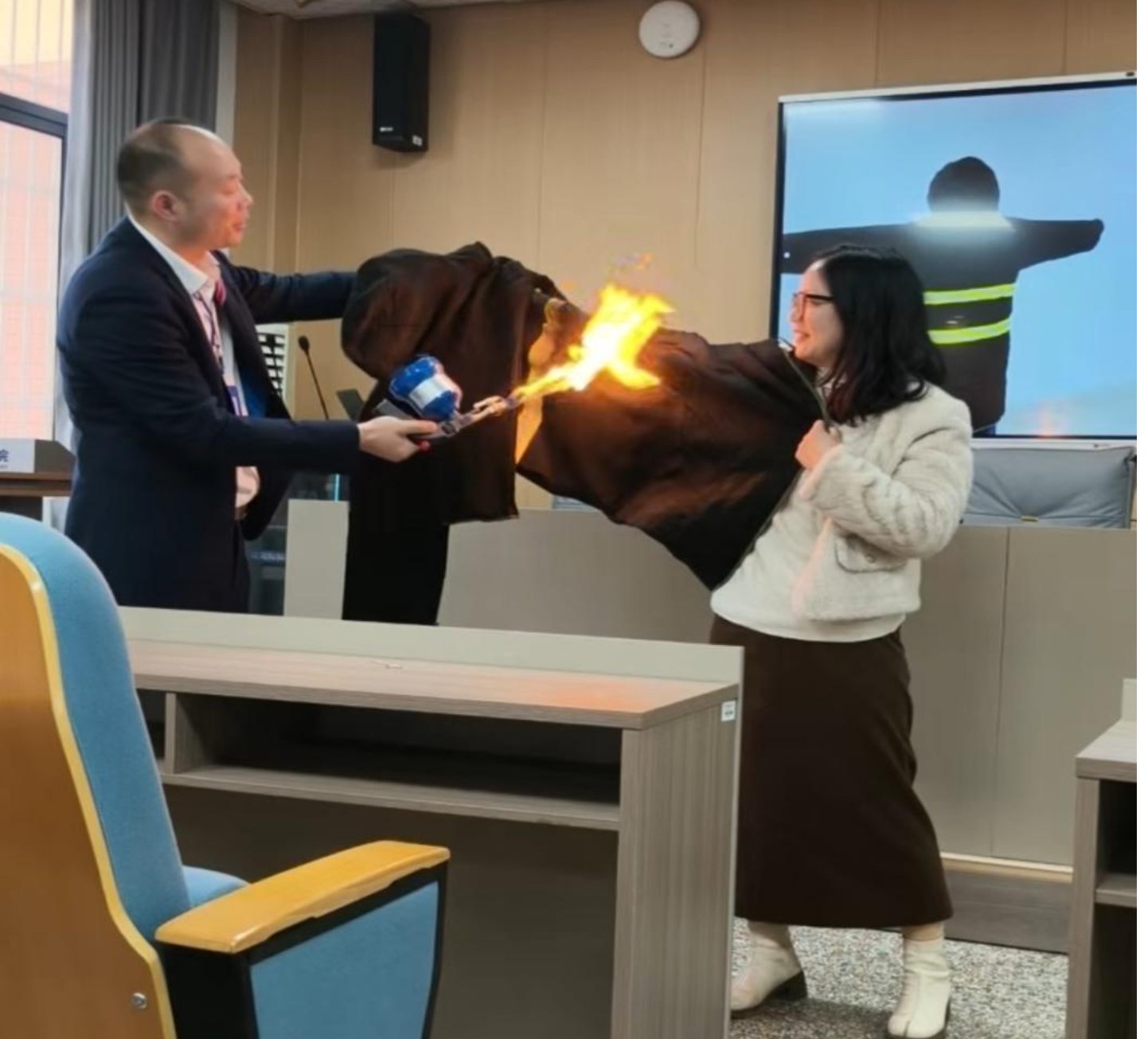 为让消防安全知识落地生根,林健教官重点讲解了各类消防器材的功能特性与正确使用方法,尤其针对新一代灭火器的操作步骤、“灭火猫”自动灭火装置的工作原理、应急防火衣的穿戴规范等新型消防设备进行了详细介绍。讲解过程中,教官通过实物展示、现场操作演示的方式,手把手指导师生掌握灭火器“提、拔、握、压”的核心操作技巧,耐心纠正了大家在日常消防认知中的常见误区,反复强调“预防为主、防消结合”的消防安全工作方针,引导师生树立“主动防范、科学应对”的消防安全意识。